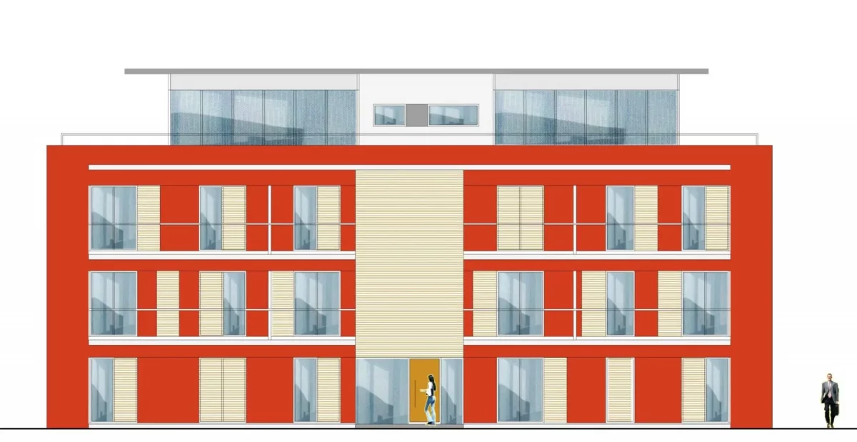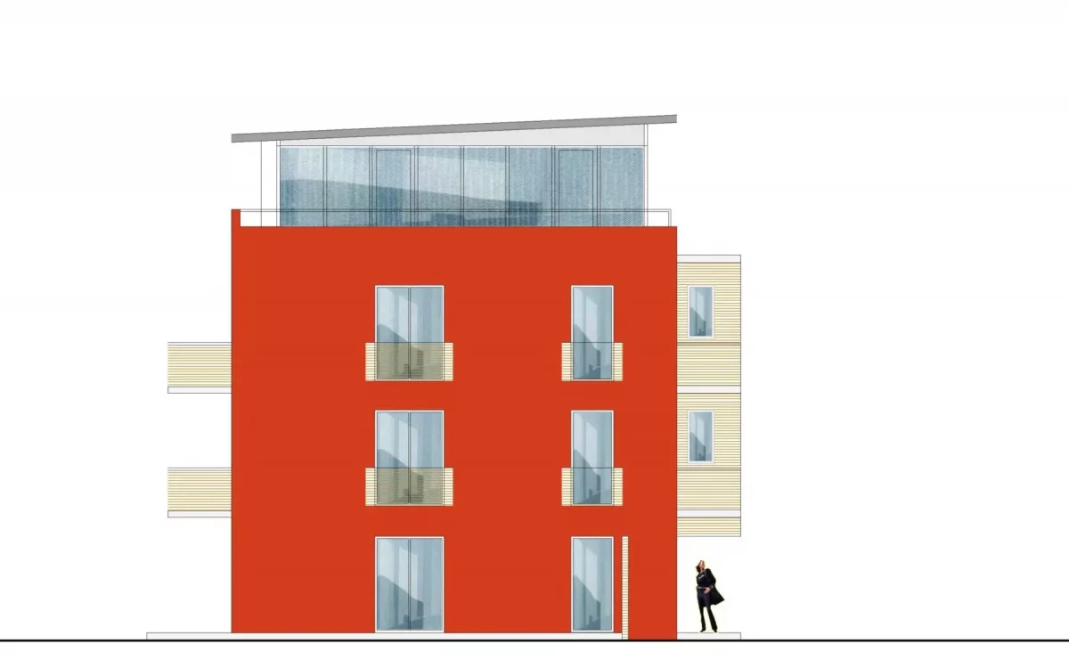 Im Staffelgeschoss wird durch die geplante Glasfassade als Pfosten-Riegelkonstruktion ein Maximum an Tranzparenz angestrebt. Die auskragende Pultdachkonstruktion dient dem Sonnen- bzw. Witterungsschutz auf den Dachterrassen.