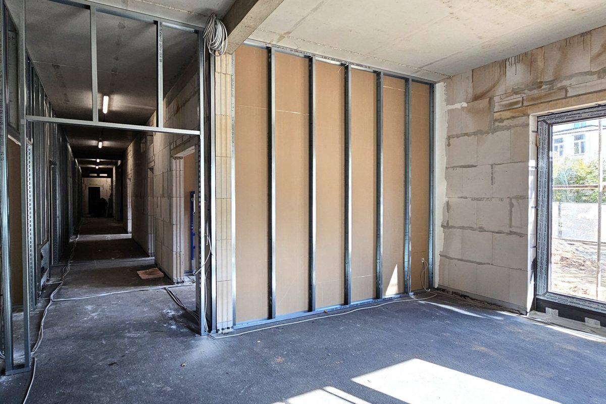 Zur Zeit erfolgen der Einbau der Fassadenelemente, die Fassadenbekleidung und der Innenausbau mit den Trockenbauarbeiten.