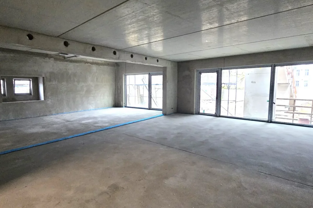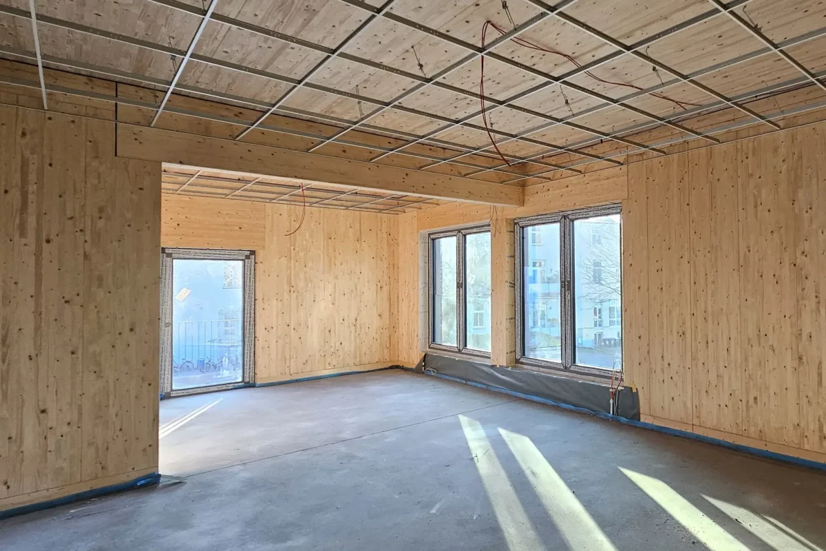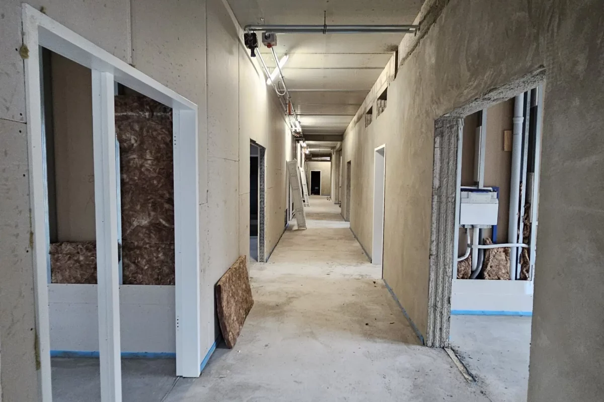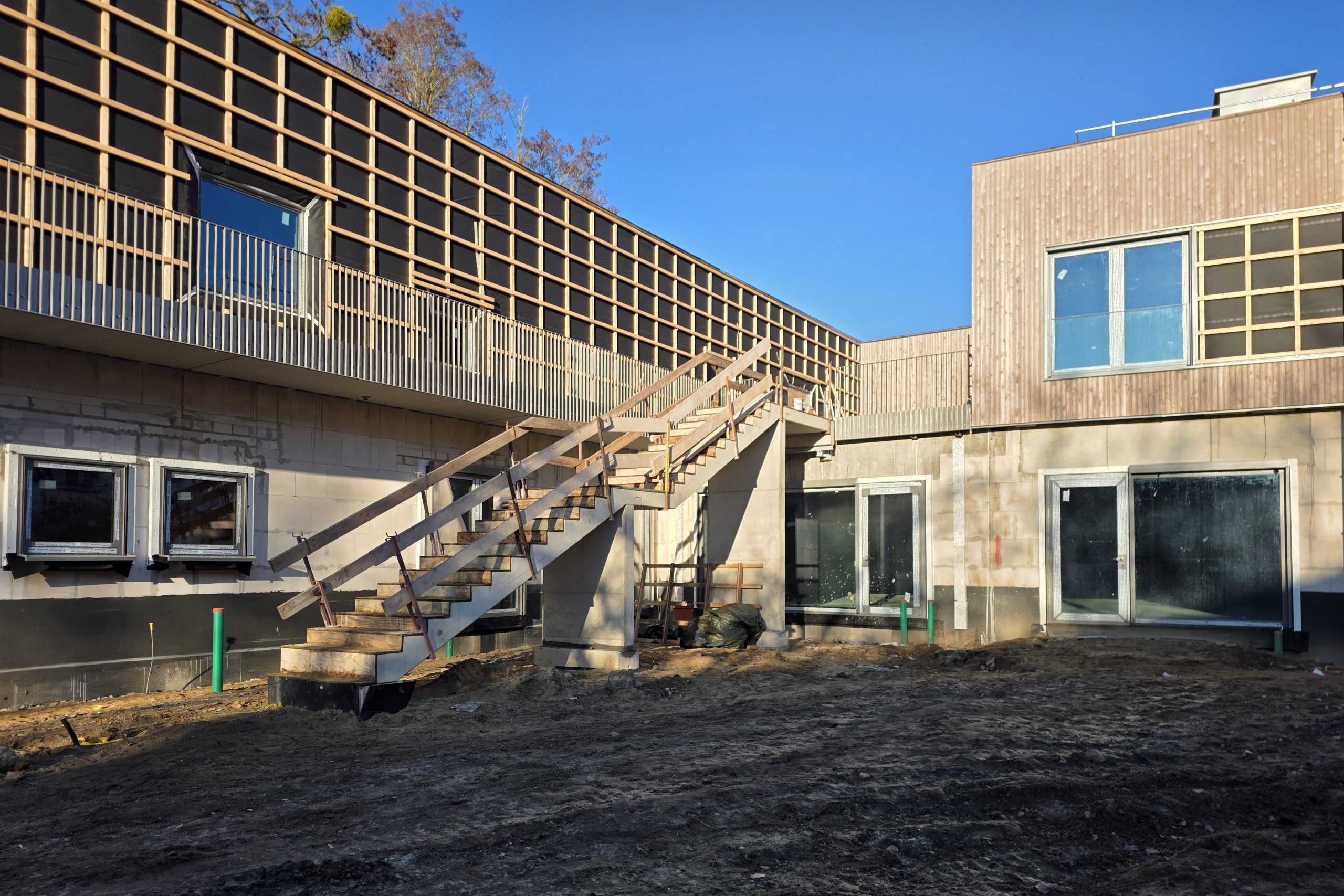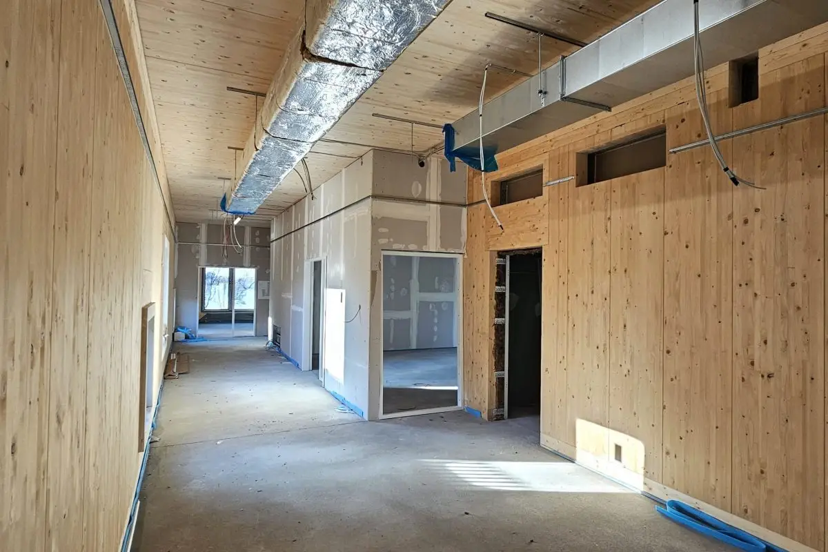 Die Tiefbauarbeiten begannen im Februar 2025. Im Juli 2025 wurden die Erdgeschoss-Massivbauarbeiten beendet, die Holztafel-Montagearbeiten im Obergeschoss Mitte August 2025.