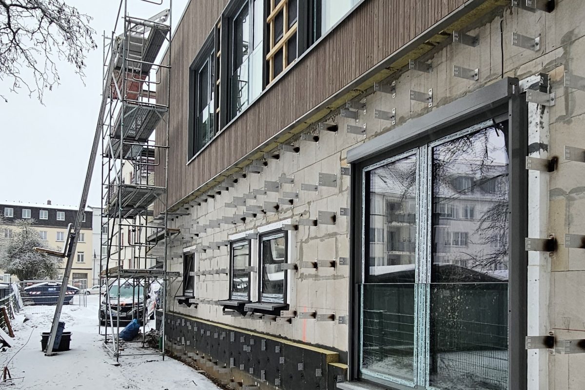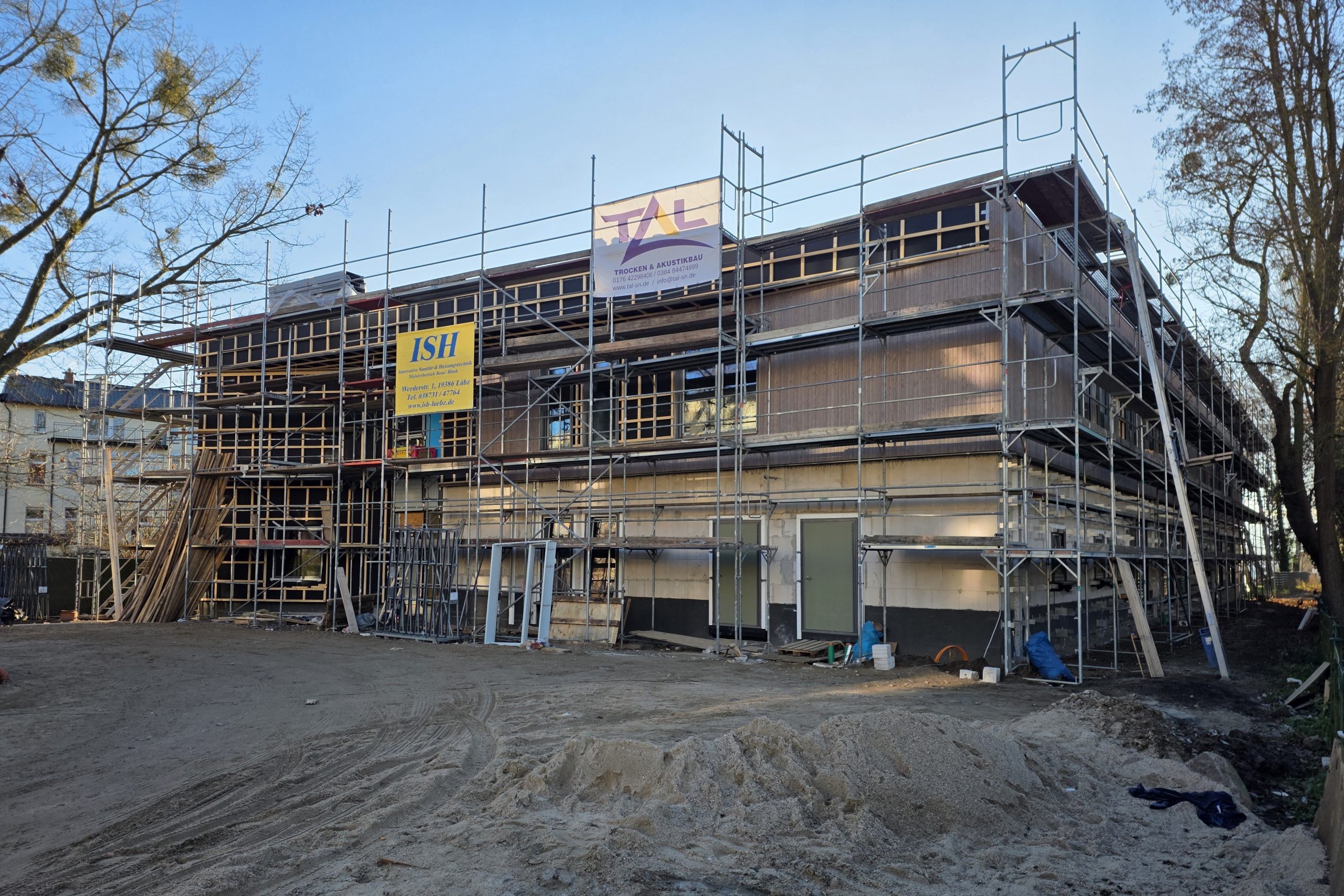 Zur Zeit erfolgen die Arbeiten zur Fassadenbekleidung und der Innenausbau mit den finalen Trockenbauarbeiten, sowie den Haustechnikinstallationen..