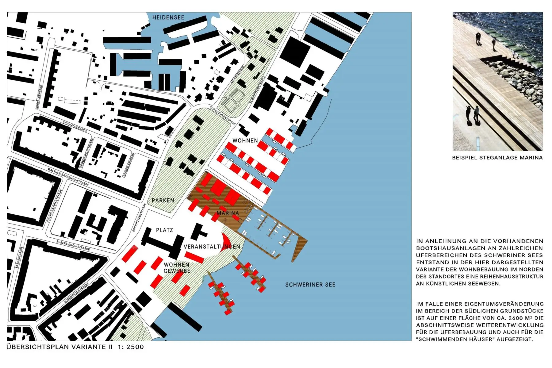Die Standortentwicklung erfolgt auf der Grundlage der Verbindung zwischen der historischen Stadt und einem neuen, identitätsstiftendem Ort am Schweriner See. Dieser Ort hat dabei sowohl die Wegeführung zum Standort zu leisten, mit einem Empfang am See, als auch die Verknüpfung zum See. Entwicklungspotentiale entlang des Seeufers sind zu berücksichtigen.