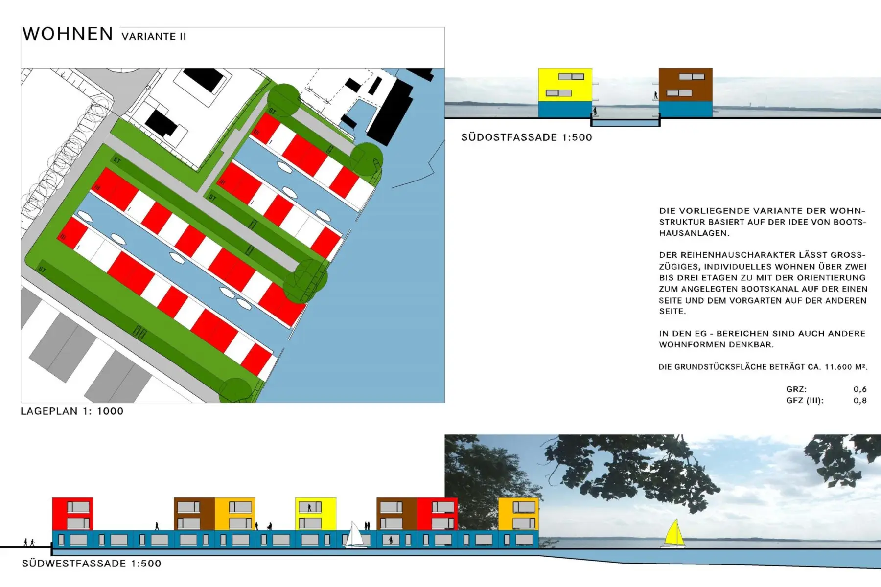 Mit einer standortbezogenen, maritim geprägten Nutzungskombination von Marina, Wohnen am Wasser und Wohnen auf dem Wasser, ergänzt durch die entsprechenden Servicefunktionen, ist ein Gesamtkonzept darstellbar. Diese Nutzungskombination soll zusätzlich zu einer Identitätsstiftung und „Adressenbildung“ beitragen.